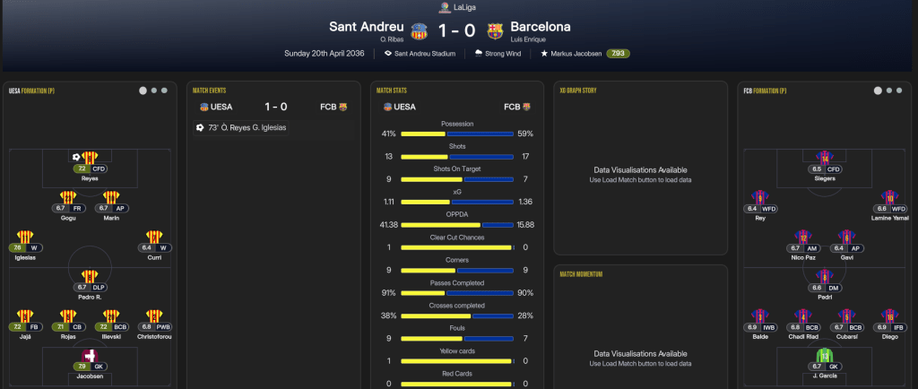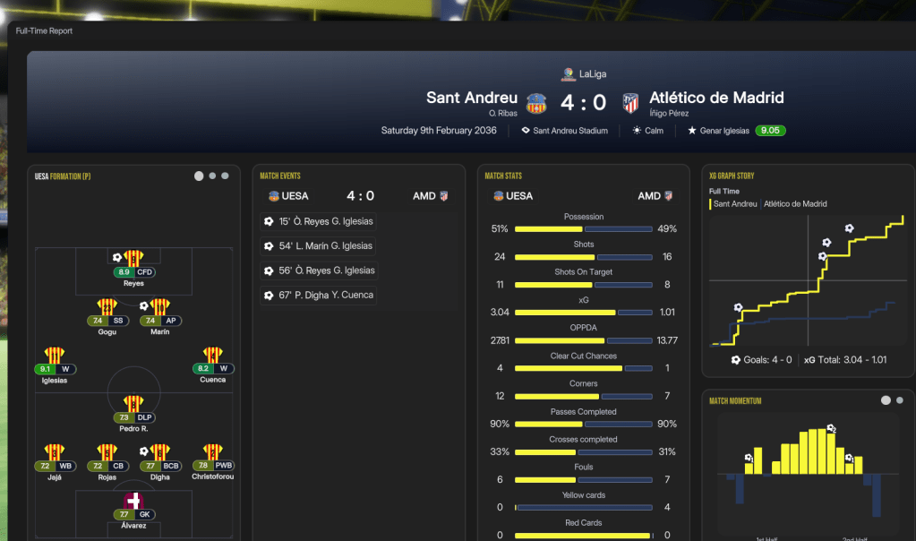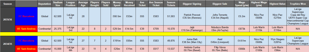 Despite reaching last season’s Champions League Final, Sant Andreu’s league finish took them back into the Europa League, which they won in 2034. They began with a tough game at home to Marseille and, with necessary rotation, a calamitous Jacobsen debut cost them a 4-1 defeat. But Folleco’s first goal for the club led a 2-1 win at home to Slavia Prague, before wins at Molde and Panathinaikos and a 3-0 victory at Sporting led by goals for Cuenca and left back Tales. Folleco and Marín goals downed Crvena Zvezda in the new year to cruise into the knockouts, before finishing up with a 2-1 win over Nordsjaelland to finish 5th.