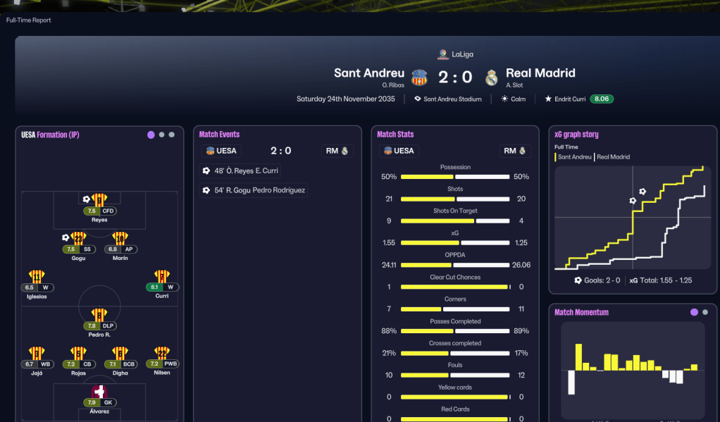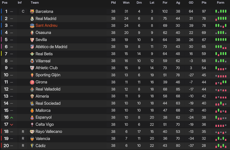 A few tricky fixtures followed, but a decent finish to the season saw Sant Andreu finish in a new record high of 3rd. They finished on 78 points after 24 wins, 6 draws and 8 defeats, scoring 68 and conceding a league-low 30. Marín was the 3rd-best player in LaLiga with a 7.29 average rating, only behind Barcelona’s Nico Paz and Iu Rey. He was also the 10th top scorer with 16 in 38, with Reyes 11th with 15 in 37, and made the 2nd most key passes (114), while Curri and Iglesias were the 8th top assisters with 10. And Ribas claimed his first LaLiga Manager of the Year award.