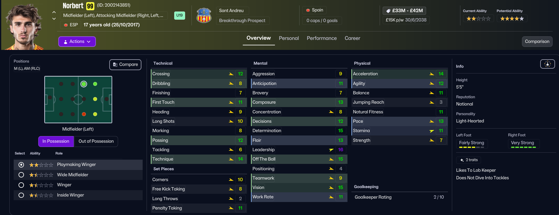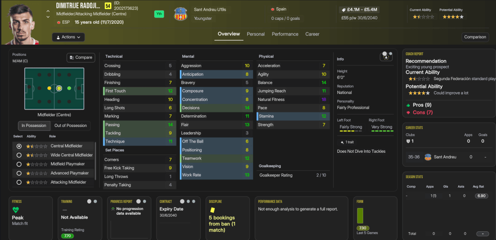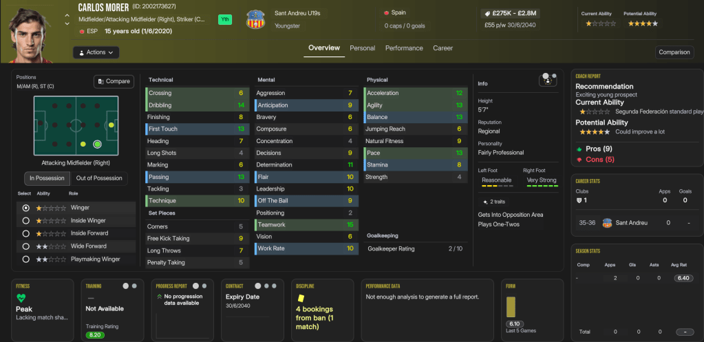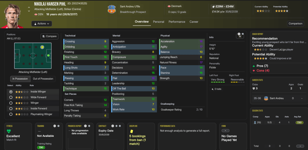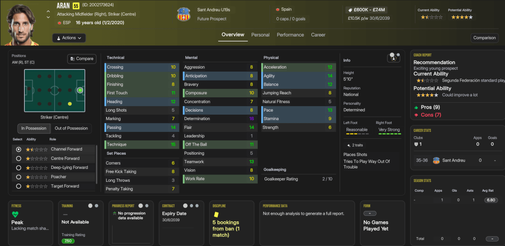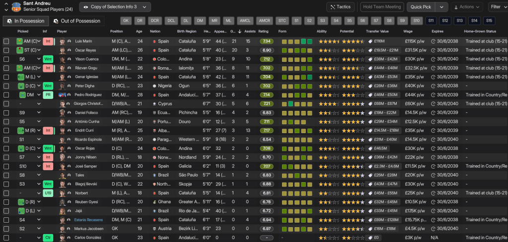 The future at Sant Andreu was very bright, as Folleco and Pihl came 3rd and 4th on NxGn 2036, with Norbert 8th, left back Kelechi Suleiman 31st and Nilsen 44th. They also had another stellar youth intake with 4 elite prospects and 2 top players, led by 5-star potential attackers Aran and Carlos Morer and midfielder Dimitrije Radojicic. That takes the club to 23 players with 5-star potential, 13 of which are in the under 19s, as well as six more with 4.5-star potential. The best of the lot, potentially, is winger Souleymane Kouadio, along with Folleco, Cunha, Espinola, Morar, Grima, Henrique Mira, Aran, and last year’s intake stars Pablo Guerrero and Aran Herrera.
