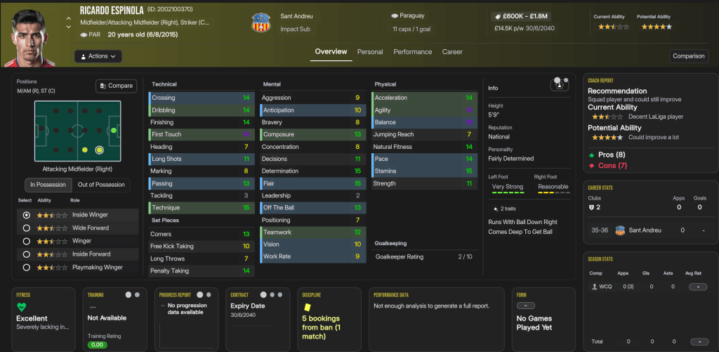 The club’s meteoric rise demanded off-field improvements, which arrived in the form of the imaginatively named Sant Andreu Stadium, which seats 25,375 supporters. Recent events had also seen rapid financial gain, racking up taxable profits of £60.95m in the last 12 months. That was aided by six new sponsorship deals worth £2.1m that took its total sponsorship income to £6.4m. As a result, the bank balance passed £100m for the first time. However, the Sant Andreu somehow only gave Ribas a £26m transfer budget, with £300k spare in the £966k weekly wage budget. That was added to by left back Nduduzo Banda moving to Saudi for £8m.