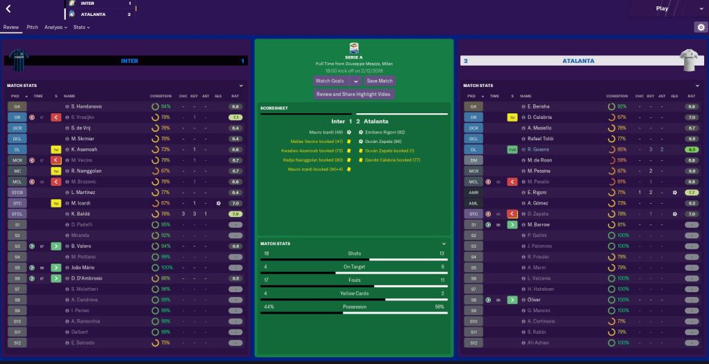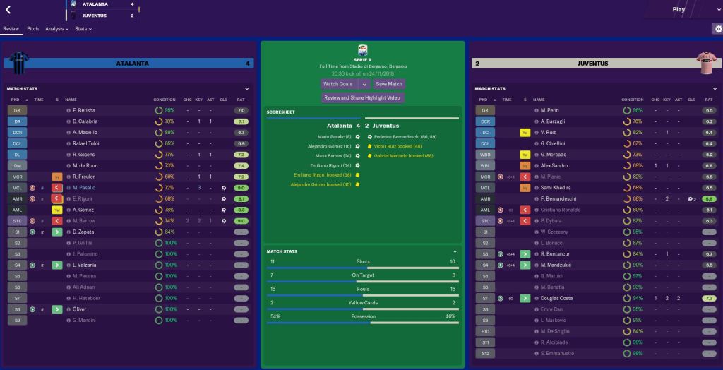 Juventus were in town, and I was worried. I went a little more defensive, but it seemed to kickstart our attack into overdrive. Pasalic gave us an eight minute lead, Gomez doubled it eight minutes, then another eight minutes later and unbelievably we were 3-0 up through Musa Barrow’s first goal of the season. Cristiano Ronaldo, Paulo Dybala, Giorgio Chiellini, Sami Khedira and co were having their pants pulled down, but it got even worse nine minutes after half-time as Rigoni added a fourth. 4-0 up on Juve, it was unheard of and, despite a late Federico Bernardeschi double, I was elated with the huge win.