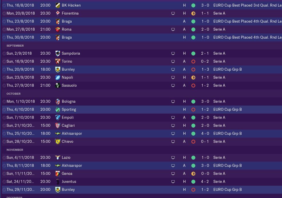 With European football confirmed, attention turned to the league and we got our game going with a 2-0 win at AS Roma. I went defensive, held them off for 80 minutes, then struck with two late goals from substitutes Antonio Marin and Musa Barrow. I was chuffed with my late changes and suddenly enthused about what this team could possibly achieve.