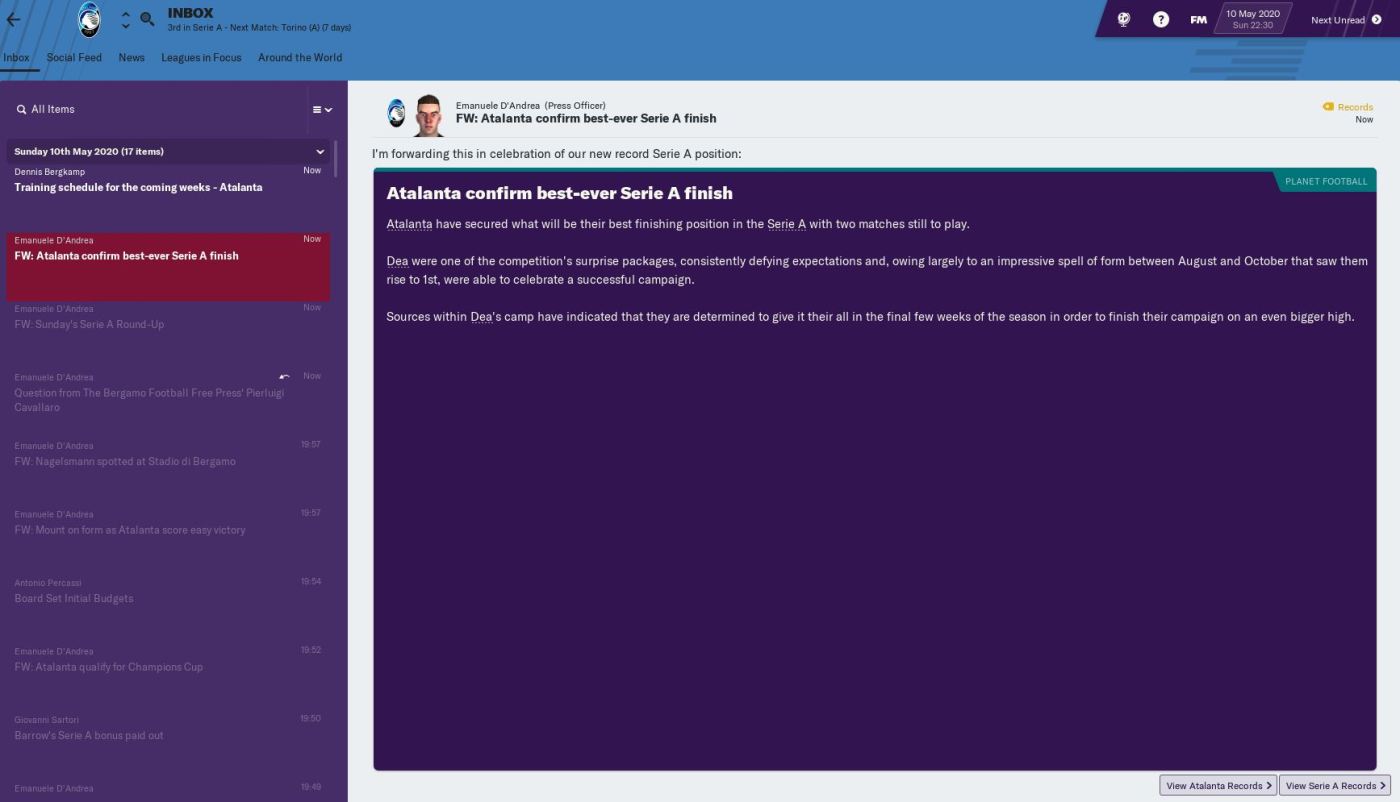 But that final day loss didn’t cloud what was a pretty unbelievably successful season, the best ever in Atalanta history, an Italian Cup quarter-final and Champions League football to come.