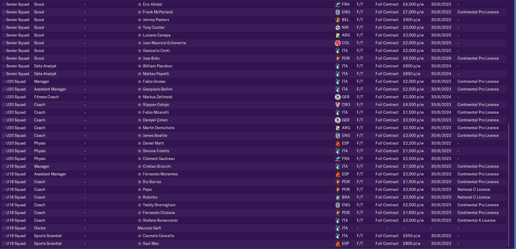 I love a former international among my ranks of backroom staff, and that’s very much the case at Atalanta. Dennis Bergkamp has been my assistant since the second season, while Hermann Hreidarsson and Dean Holden have been coaches since the first season and I’ve just promoted Ivan Cordoba and Carlos Valderrama from the youth team setup. Elsewhere, former Barcelona defender Eric Abidal is on my scouting team.