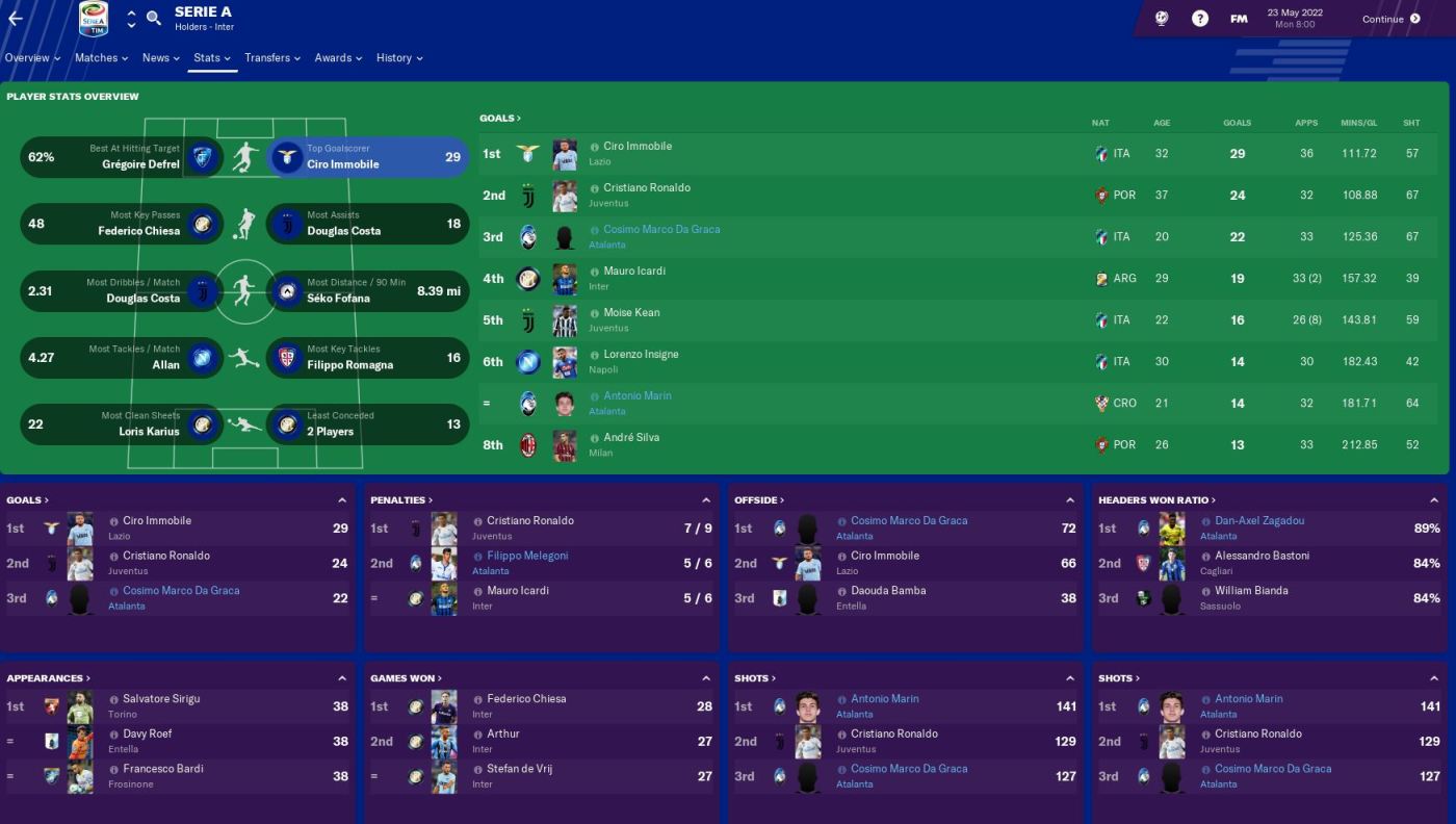 Da Graca finished the campaign as our top scorer, bagging 23 goals in all competitions of which 22 were in Serie A. Interestingly, holding midfielder Filippo Melegoni – who does play as a Deep Lying Playmaker – was our most creative force with 15 assists, while Pereira led the way in performances with an average rating of 7.25. Marin and Da Graca ranked first and second for shots in Serie A, which I’m not sure is a good or bad statistic.