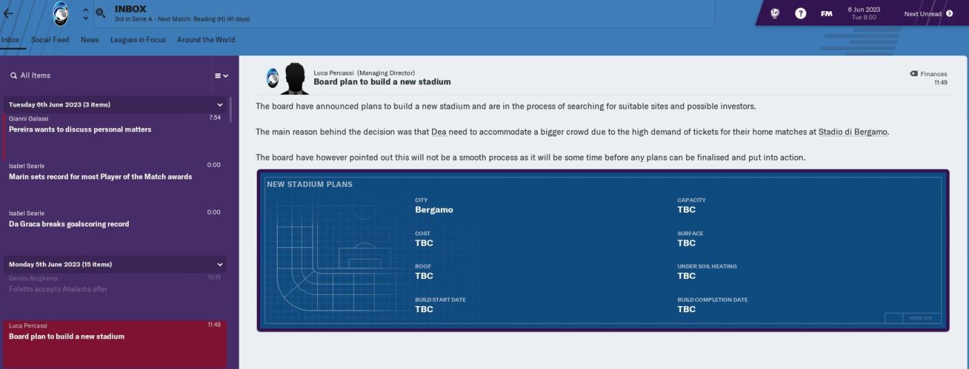 There was more exciting news at the end of the season as, after a number of requests to expand our 27,000 capacity ground, the Atalanta board announced plans to build a new stadium. When and the size of which is, as yet, unknown.