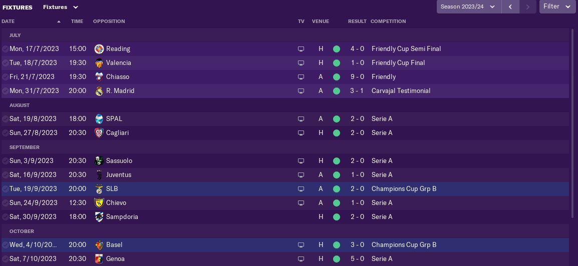 That included a 1-0 win at Juventus, thanks to a goal from Frederic Pereira and a 3-0 win at AC Milan, with goals from Pereira and two subs Timotijevic and Karioca. We also enjoyed a 5-0 home hammering of Genoa, in which our box-to-box midfielder Denis Roncaglio scored a hat-trick.