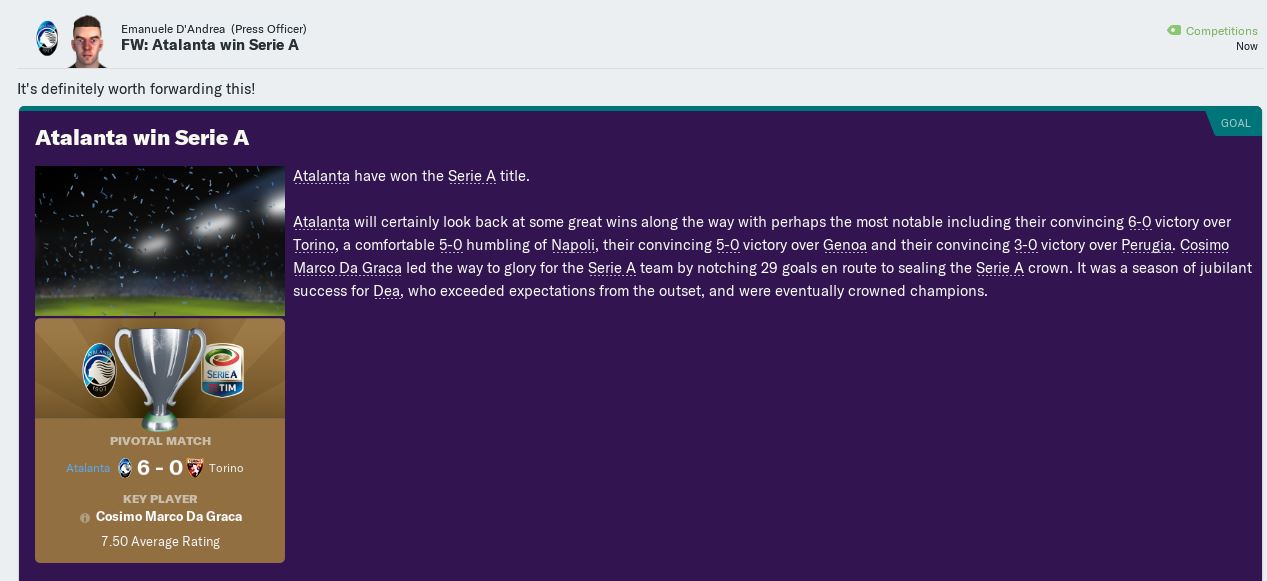 The old adage of “you can’t win anything with kids” has been well and truly proved wrong by a youthful Atalanta side consisting of just one player aged more than 23. The virtually unthinkable when this game began in 2018 has come to fruition at the end of the sixth campaign, with Atalanta wrapping up their maiden Serie A title in May 2024.