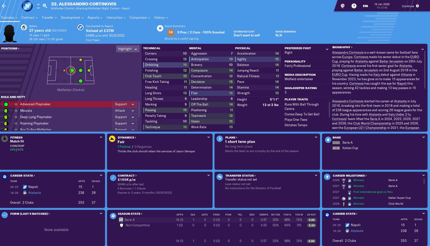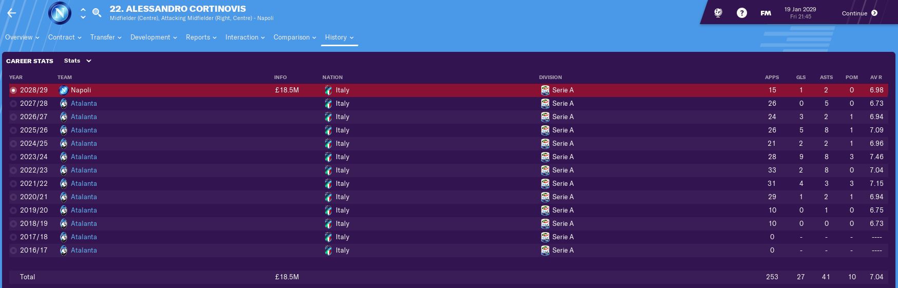 We also moved on versatile midfielder and Atalanta youth product Alessandro Cortinovis after 238 league games. I loved Corti but he couldn’t get into our team ahead of the incredible Matteo Giacalone and Timmi Uldbjerg and was beginning to get unhappy about, so I let him go to Napoli for a decent £18.5 million.