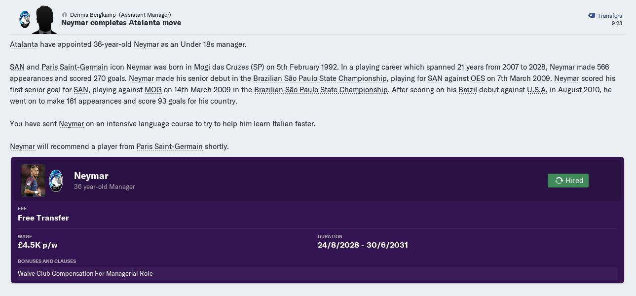 Behind the scenes, Lionel Messi made the step up from Under 18s Manager to become a Coach, and in his place came another retired legend of the game – Neymar. The Brazilian retired that summer at the age of 36 having stayed with Paris Saint-Germain for the full 10 years of the save, eventually accumulating 270 goals in 566 league games and 93 goals in 161 caps for Brazil.