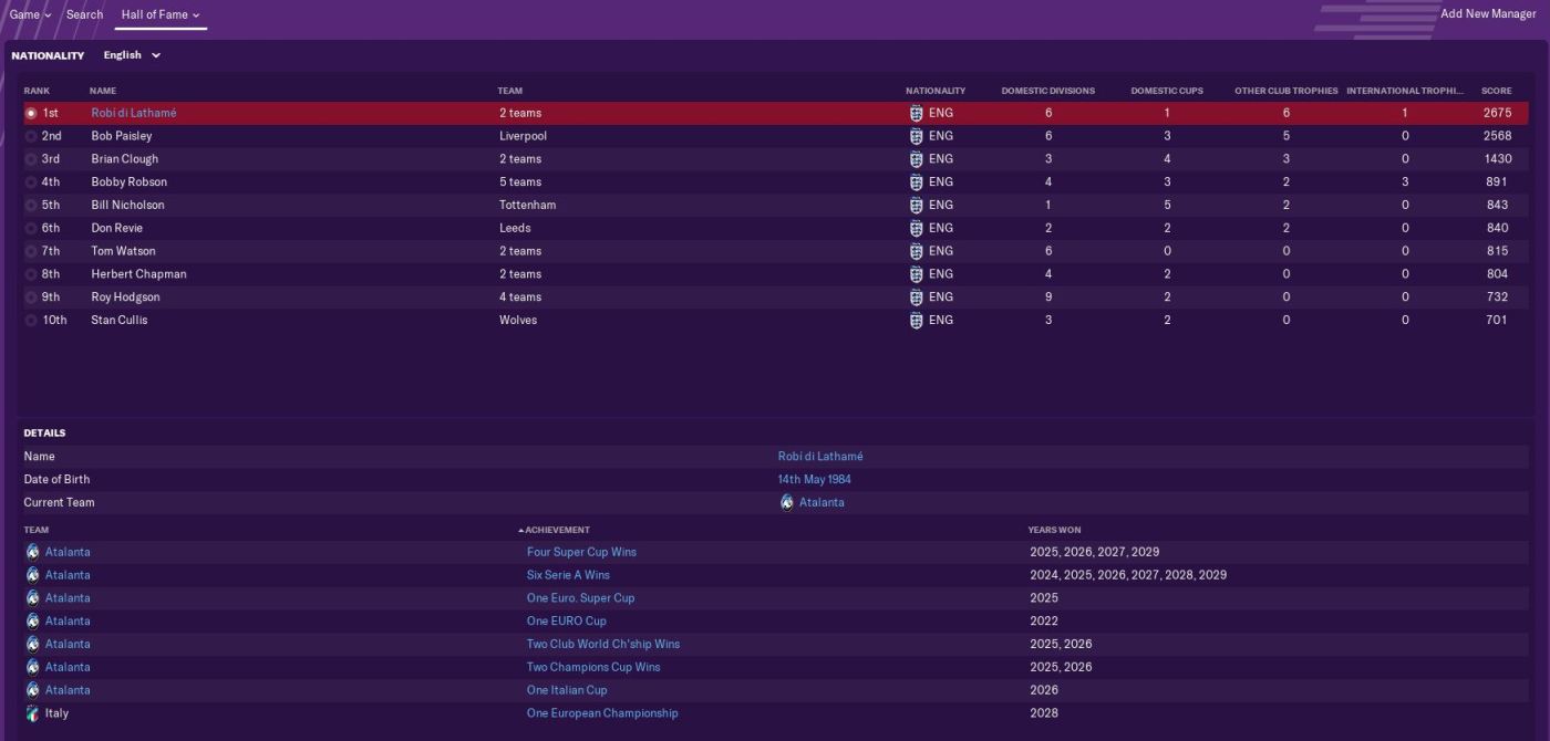 These successes saw me top the Hall of Fame for English managers, which is surely the perfect way to end any Football Manager blog. I’m now also 6th in the Worldwide category, 10th in Continental (which doesn’t make much sense) and 4th in the Italy nation rankings.
