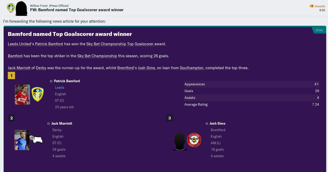 And our players totally dominated the individual awards. Bamford hit an impressive 26 goals in 41 games to finish as the top goalscorer and Douglas claimed the most assists in the league with 13 and Clarke only one behind him.