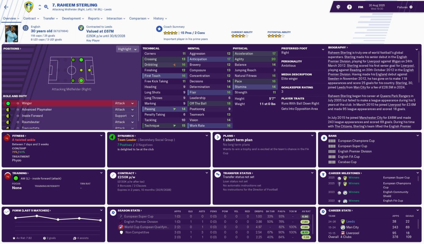 I’ve never seen a team-talk work that well, especially in a big match, and I honestly don’t know how we won this game. But I genuinely screamed out Sterling’s name and leaped around my flat in joy at the final whistle. What a victory! Leeds United – champions of Europe!! Also, I earned the Comeback King badge for the first time I’d come back from two goals down to win on Football Manager 2019, which I’m not convinced is true.