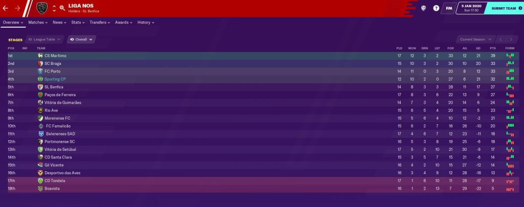 But we are in good shape in the league, still unbeaten in 12 games and sitting 7 points behind leaders CD Maritimo – with a ridiculous 5 games in hand. I don’t really know how that’s been able to happen, but I suspect we’ll get landed with a fixture overload at some point. Importantly, we are just 1 point behind Porto with 2 games in hand.
