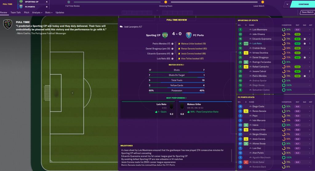 Then we welcomed Porto to José Alvalade Stadium and put in probably our best performance of the save so far. At half-time we were 3-0 up from just 9 shots and had dominated 62% of possession. Pedro Mendes opened the scoring by poking home from close range after Luis Neto’s header from a corner, and Eduardo Quaresma made it three with his first ever senior goal.