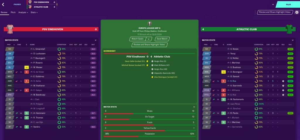We also got our Europa League draw during the international break, and we’re up against PSV Eindhoven, Dinamo Zagreb and FK Astana. First up was the toughest game of the group, PSV away. We got off to a flyer as striker Ros teed up midfielder Ros to score his first goal of the season after 3 minutes.
