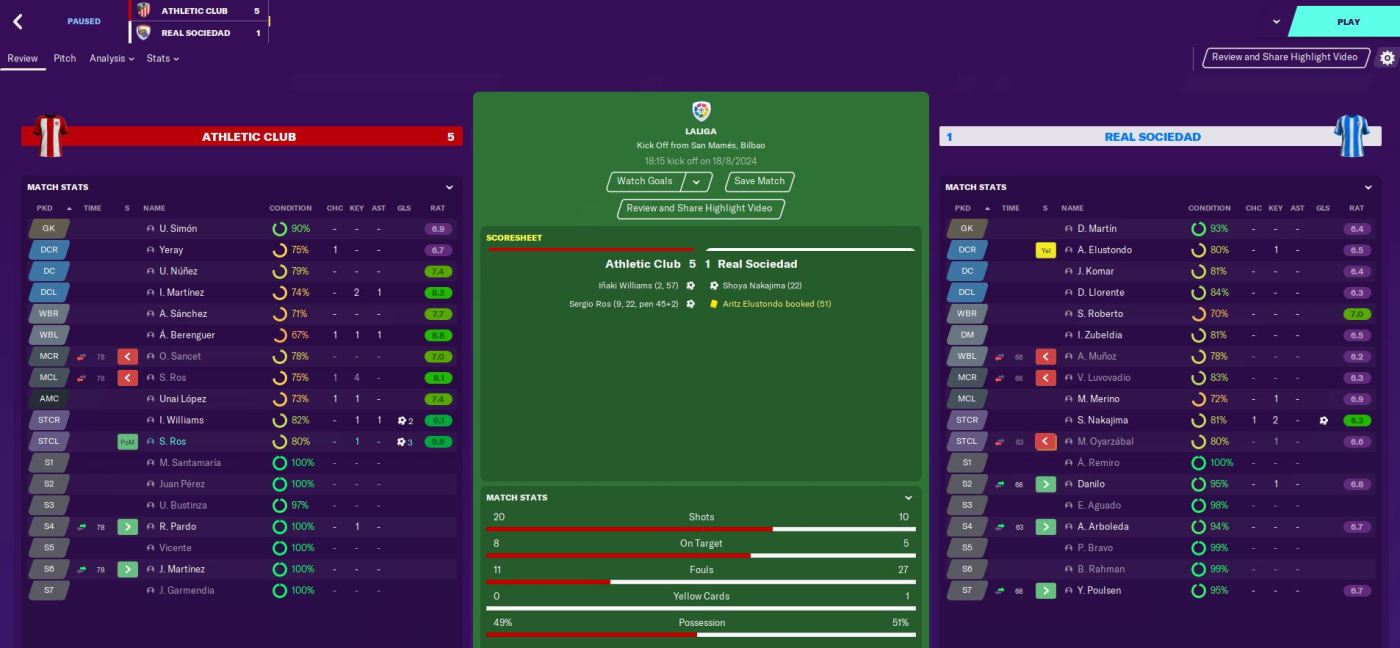 Sociedad got back into it on 22 minutes with a superb Shoya Nakajima free-kick. But then we went down the other end and scored in the same minute to restore the two-goal lead. Right wing-back Asier Sanchez put a cross in, left wing-back Alex Berenguez headed towards goal and Ros turned it in from close range. 3-1 inside 22 minutes!