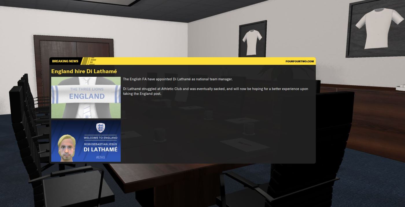 England. I kid you not… we have wangled our way into becoming the manager of England with a 37% win-rate in 16 matches as a manager. Absolutely bonkers!