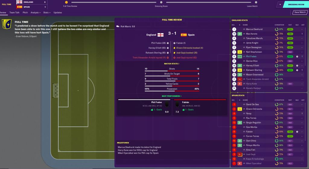 Next up though, was World Champions Spain at home and things weren’t looking good when they scored in the first minute through Fabián. But we got back level as Phil Foden, now playing for Real Madrid, scored one of the best goals I’ve ever seen on FM. He picked up the ball deep in his own half, slalomed through multiple challenges, jinked his way into the box and smashed home. It was a magnificent solo goal and that lifted the entire team.