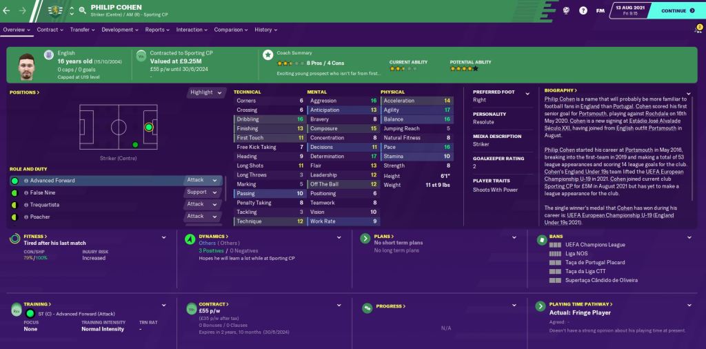 The Summer transfer window saw us add a couple of new young additions, including 16-year-old English striker Philip Cohen. We paid Portsmouth £5 million up front, which could rise to £18 million with a load of potential add-ons. He’s already the third best striker at the club, so I’m very excited to see how he gets on at the club.