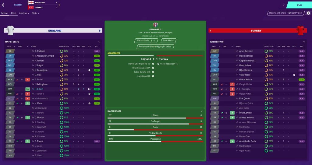 We again got a great start against Turkey as Sancho won a penalty and Elliott tucked it away, only for them to get a penalty 2 minutes later. But this England team is deadly and Foden teed up a Ryan Sessegnon rocket on 17 minutes later then Sancho scored a third on 39 minutes. Mason Greenwood was struggling again, including somehow missing from 2 yards twice in the same attack.