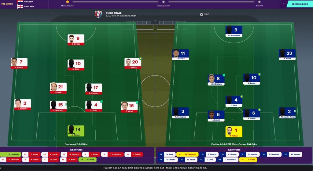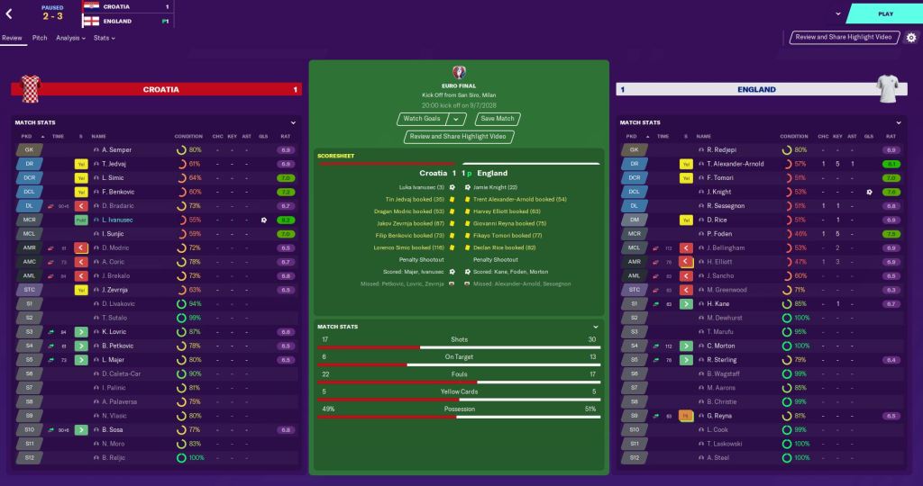Spain 0-4 England. We were into the Final of Euro 2028! And our opponents in the Final, were Croatia – who managed to beat France 2-1 in the Semi. A chance at retribution for 10 years earlier and a massive chance at a second major trophy for England.