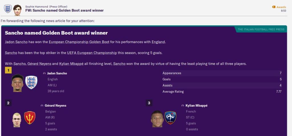 On the back of this huge win, Harvey Elliott was named Player of the Tournament and Jadon Sancho won the Golden Boot. While our players dominated the Euro Dream Team.