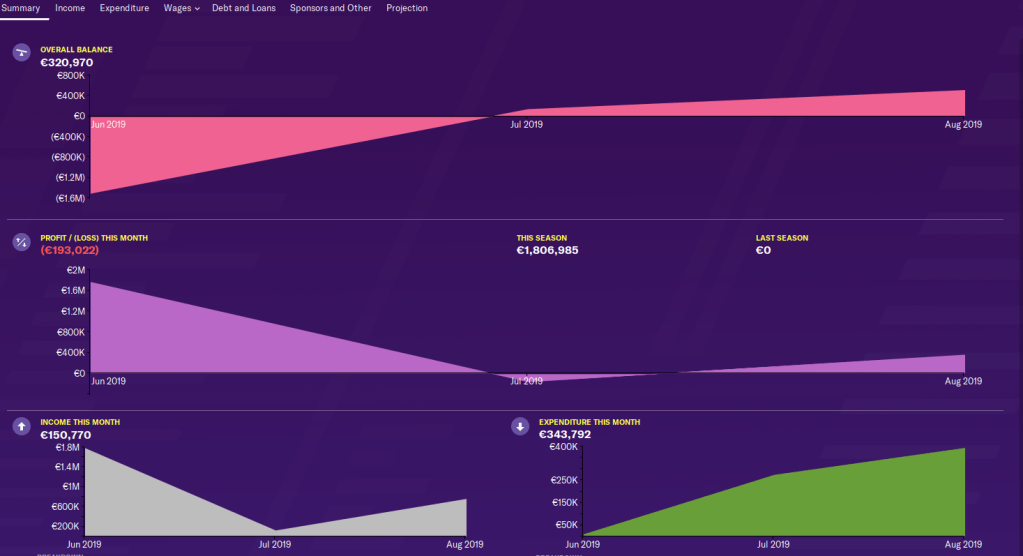 The minimal facilities mentioned above don’t look like being addressed any time soon as we have very little in the way of spare cash to address this lack of infrastructure. We currently have €300k in the balance, but we’re losing around €200k a month. Oh dear… I guess we’d better hope there’s some decent talent that could help us bring some money in.
