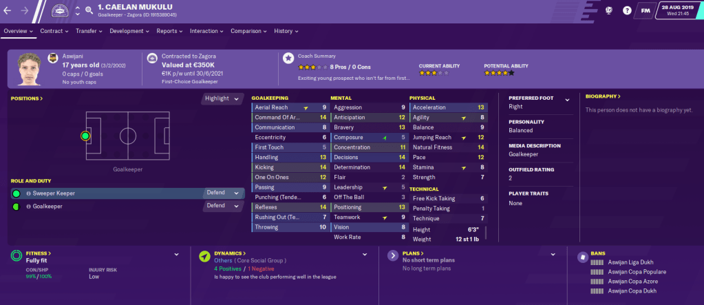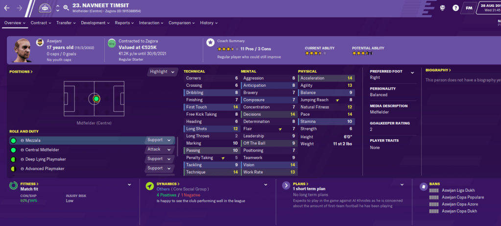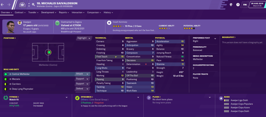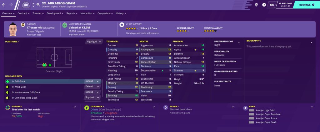 The first thing that grabbed my eye about the team was that we had several very exciting young prospects. 17-year-old right-back Arkadios Gram is already considered among our top three players and has plenty of room to improve. While I also have particularly high hopes for 16-year-old midfielder Michalis Saivaldsson, along with several 17-year-olds in left winger Martin Goronda, goalkeeper Caelan Mukulu and centre midfielder Navneet Timsit.