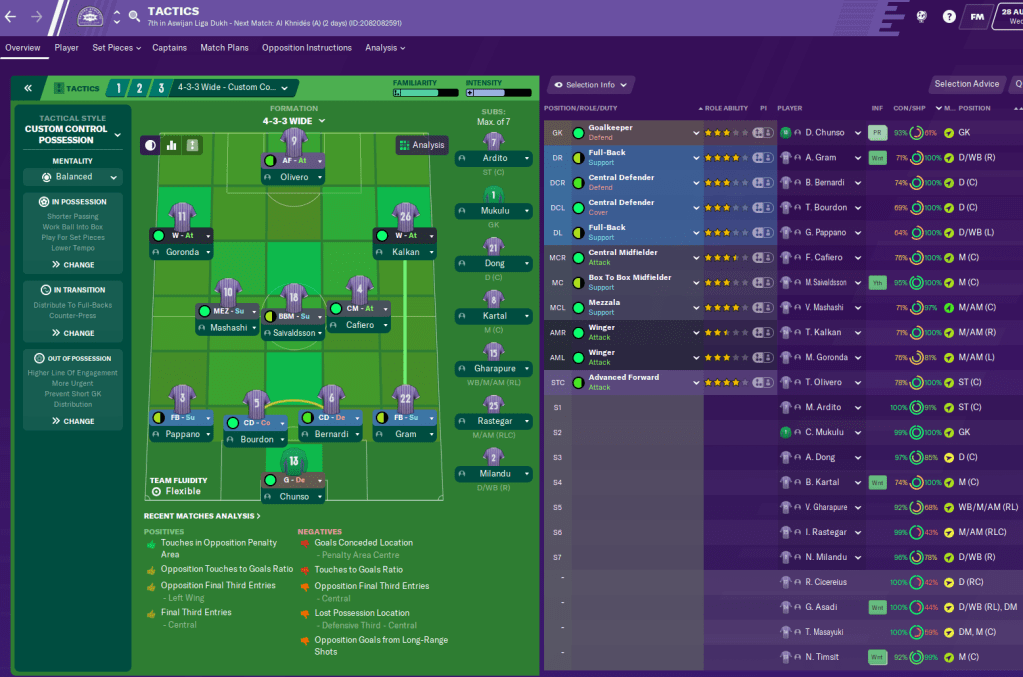 The pre-season friendlies saw us face three matches against good quality opposition. First up was Swiss side Young Boys, in which we took the lead but lost 4-2, then we managed to beat Basel 2-1, before losing 1-0 to Liga Principale side Haswara Knights. I trialled various formations, tested out several players and eventually settled on the formation above.