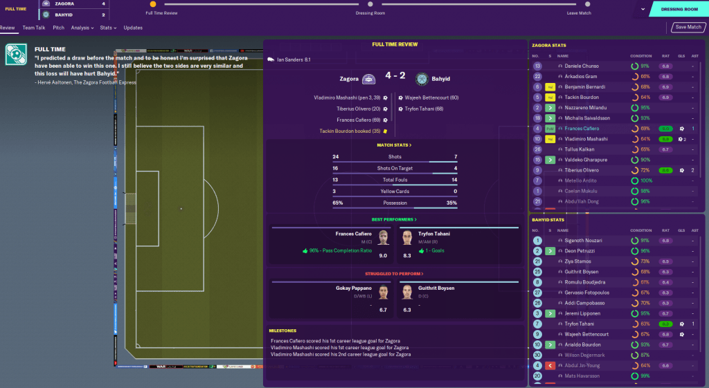 And we soon went 5 games without a win to start the campaign as we lost 3-1 at Ashab Unidi. It was at this point that I changed things up and moved away from the rather negative 3-5-2 and moved towards a more expansive 4-3-3 setup. And the switch immediately rewarded us with a first win as goals from young winger Martin Goronda and striker Tiberius Olivero sealed a 2-0 win at home to Kasra.
