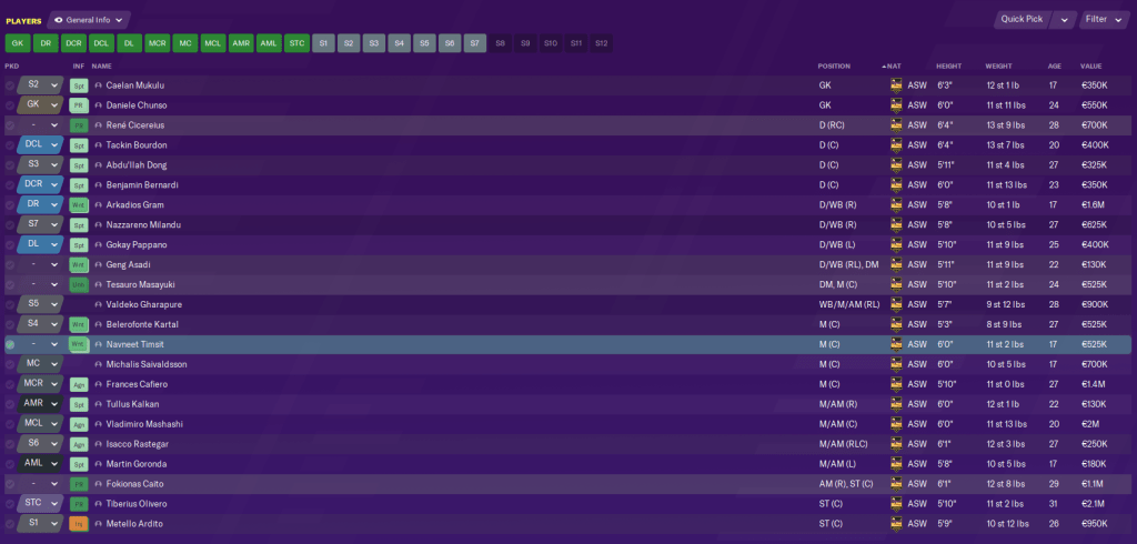 This was because the biggest strengths position-wise were at centre-back, central midfield and up front – were we had four strikers of relatively similar quality. But I couldn’t really make any of these work overly successfully. And, if you’re interested and for future reference of any names randomly dropped in, here’s the first-team squad in full.