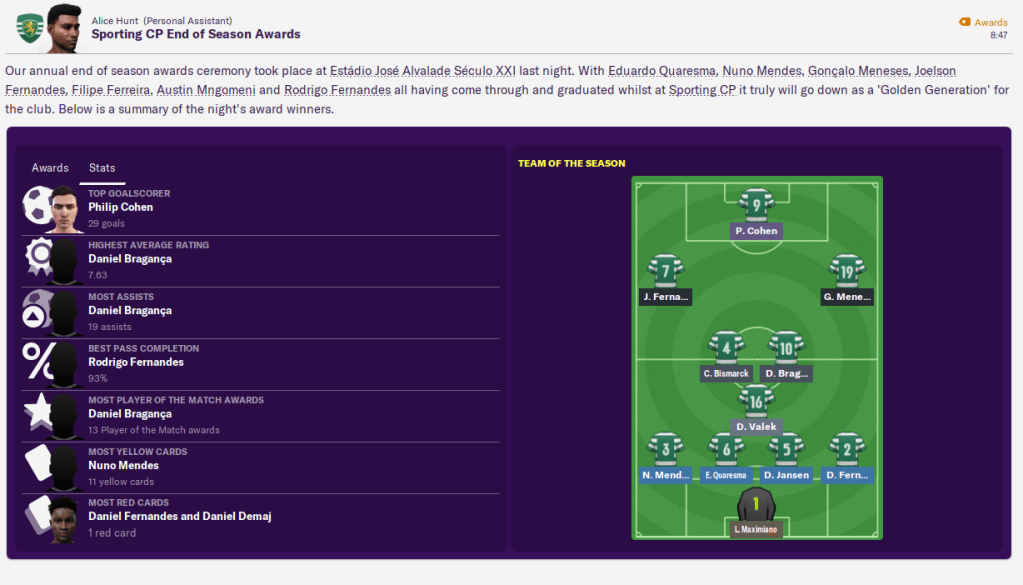 The midfielder will be in need of a new mantelpiece to make room for the Portuguese Player of the Year and Young Player of the Year, which he also won last year. I won the Portuguese Manager of the Year award for the fourth season in a row.