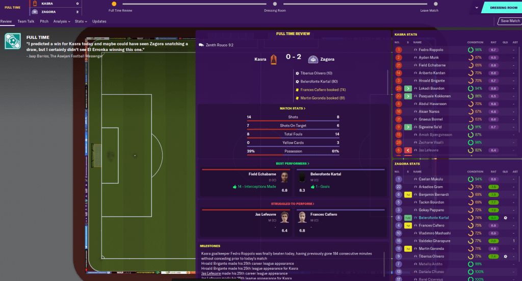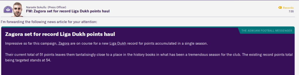 Half way through the season, Zagora manager Trebor Mahtal is already a favoured personnel of the vast majority of players in the squad. And the Board are throuhgly thrilled with the job I’m doing, including winning the Trenor di la Mes in October. So it’s safe to say that Aswijan Assignment has gotten off to a good start. The pressure was now on to maintain the good form and build something special.