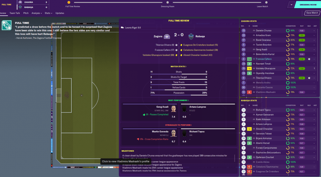 We put this strong form on the line as we hosted local rivals Rabaqa, whose manager Ioannis Cousteau was talking all sorts of smack about me pre-game. But Olivero ensured we did our talking on the pitch by putting us ahead after 6 minutes with a hilarious opener. Their goalkeeper took an age to clear a standard backpass only to gift the ball to the striker for an open goal. We doubled that lead through Frances Cafiero’s poke home from a corner 11 minutes later and won 2-0 at a canter.