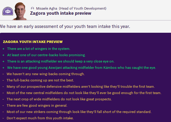We also got our first insight into this year’s youth intake, which looks OK but not great. But, on that topic, the Board have allowed me to increase youth recruitment to Basic and will be investing in our youth facilities at the end of the season.