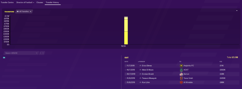 We had a bit more money land in the coffers as we sold club captain Tesauro Masayuki, who coudn’t get in our team, to Liga Principale (that’s the league above us) side Tarac Unidi for a cool £450k. While backup striker Kun Litim moved to Al Khnidés (in our league) for £86k.