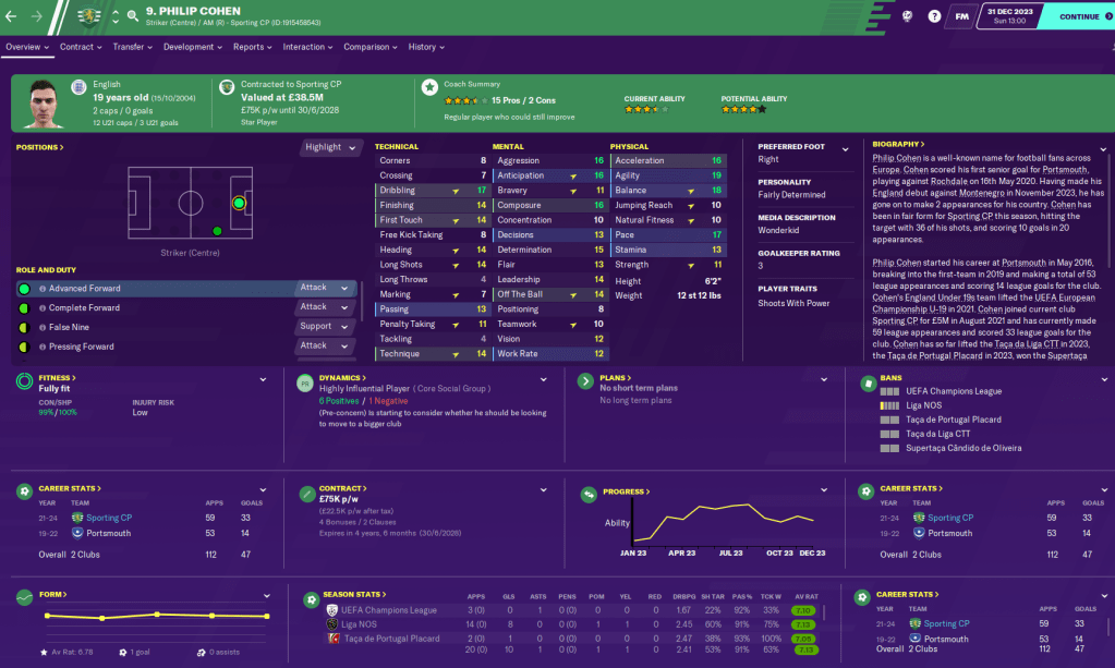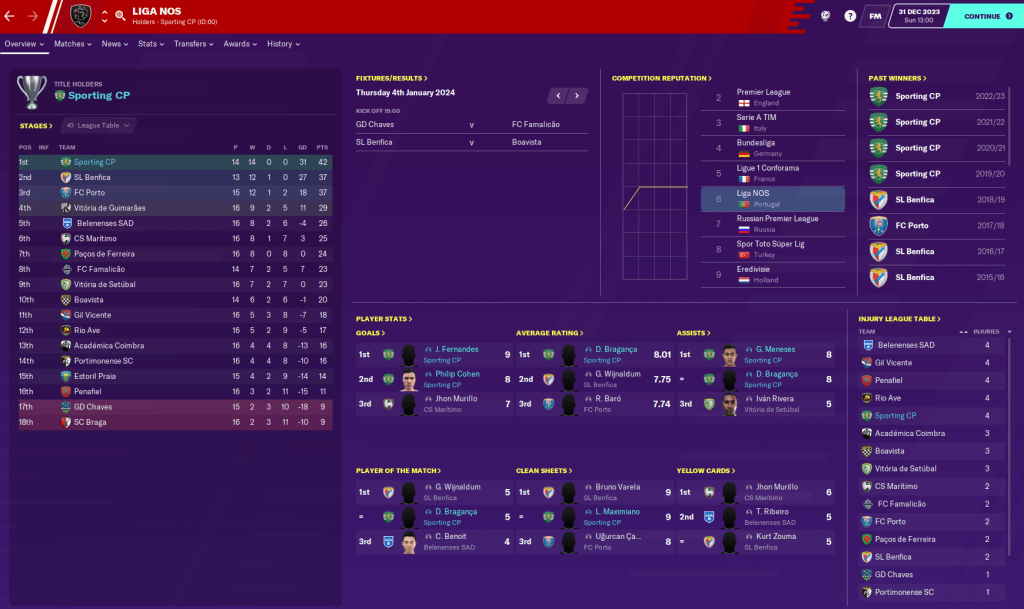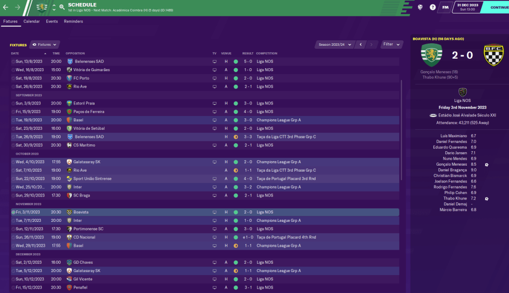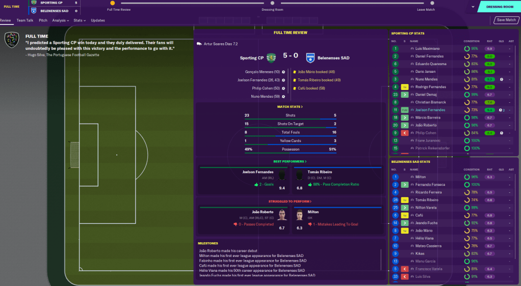 Despite that, SL Benfica were also in ridiculous form, winning 12 of their 13 matches and sitting 5 points behind us with a game in hand. J Fernandes and Cohen were the top two scorers in the league with 9 and 8 goals, while Braganca was in ridiculous form with an average of 8.01 and had the joint-most assists alongside Meneses.