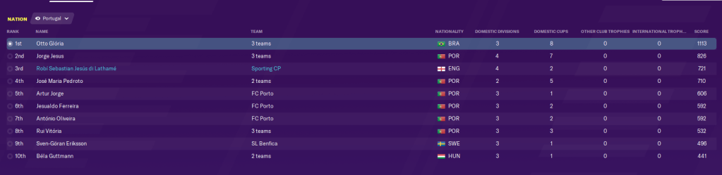 And that success lifted me into the top 10 of the English managers’ Hall of Fame for the first time. I’m now up to third in the Portuguese nation records too.