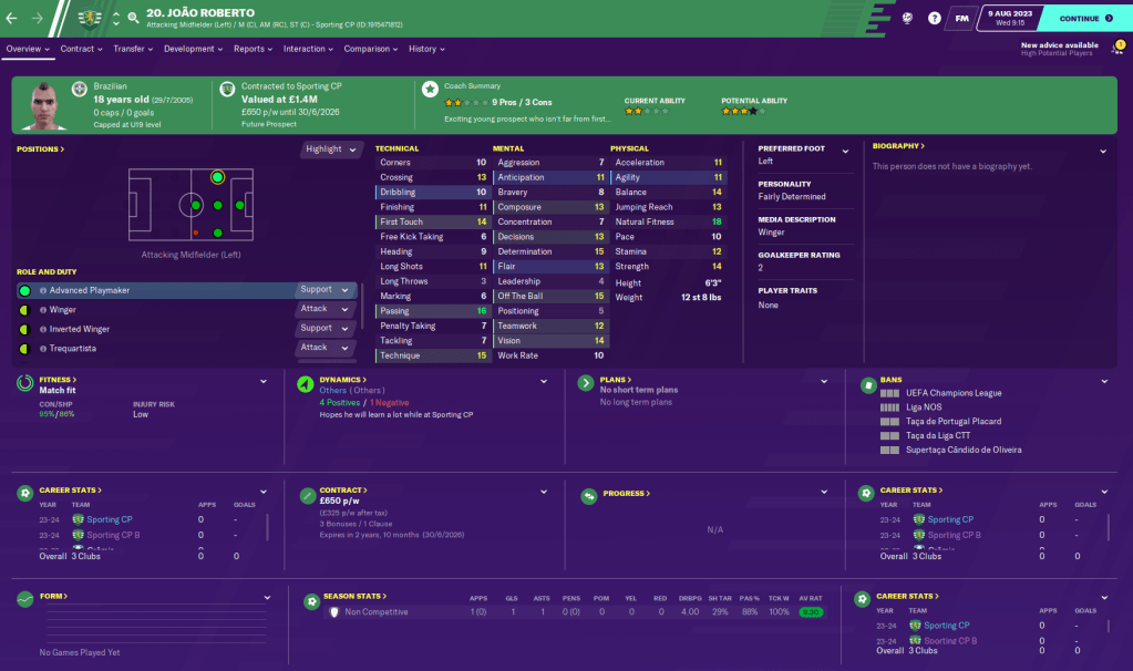 Firstly, backup defender Filipe Ferreira – who I thought was OK, nothing great – was signed by Manchester City for a potential £10.5 million. Then winger Bruno Tavares, who was some way behind our best wingers, joined Real Sociedad for the same price. But the big sale was Jovane Cabral, who’d just had an average season, joining Valencia for £30 million.