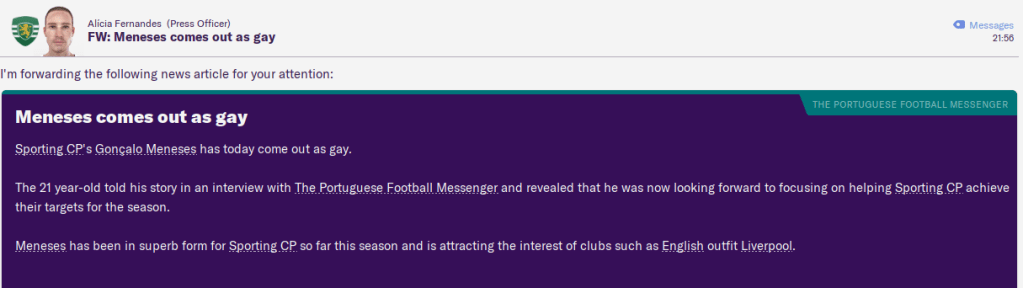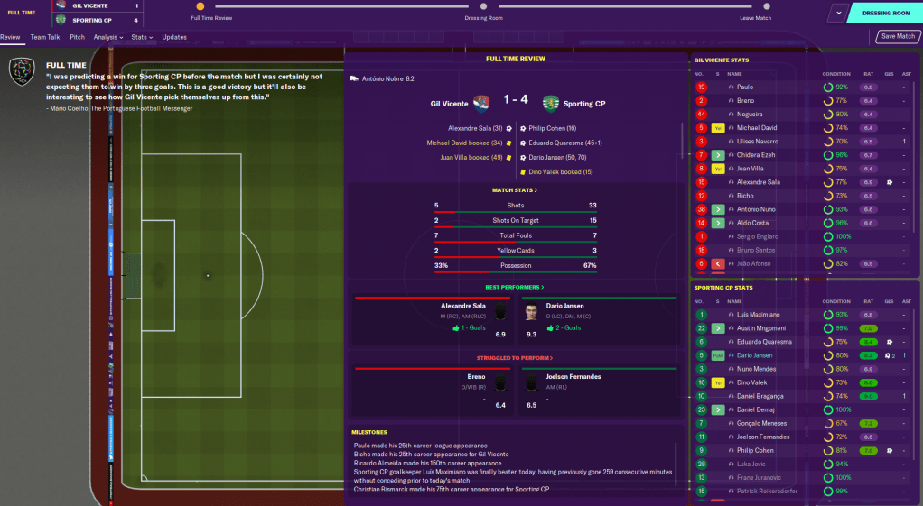 An international break followed, in which Dario Jansen, Dino Valek and Karel Knakel all made their international debuts for Holland, Croatia and Czech Republic respectively, then a proud moment for Sporting as our academy product Goncalo Meneses finally made his debut for Portugal and scored on it. Then, the very next day, this happened. I think this is the first time I’ve seen this from one of my own players on FM.
