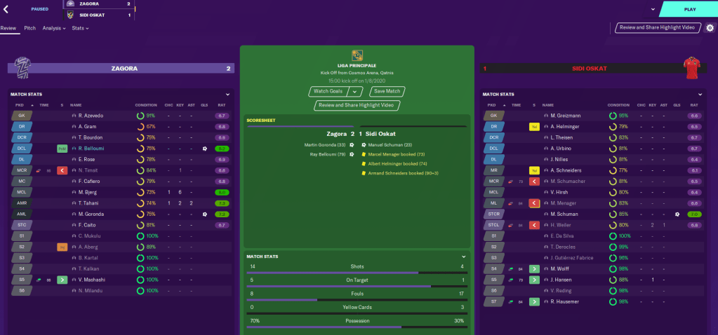 However, one of last season’s stars Martin Goronda pulled us level 10 minutes later, heading home from a Tahani cross. And that man Tahani was at it again as he swung a free-kick into the box for fellow new boy Belloumi to head home a 79th-minute winner. Belloumi earned player of the match but another newbie Bjerg – who looks like he could a bit of a God at this level – also impressed with 6 key passes earning him an 8.0 rating.