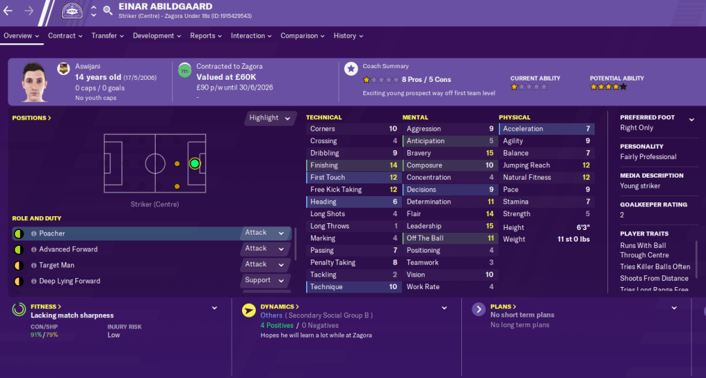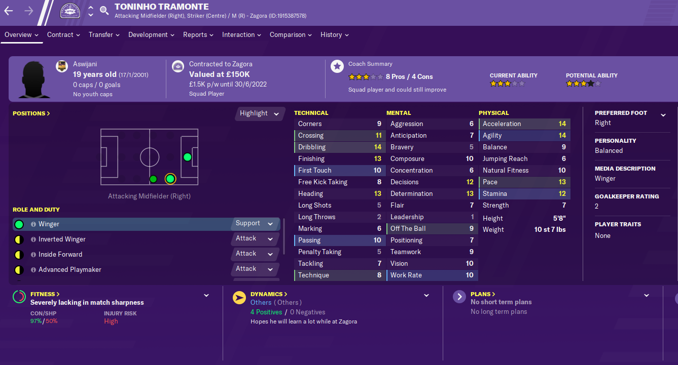 We still hadn’t spent a penny as Zagora boss, but that all changed on deadline day. Firstly, we finally brought in a backup right winger in Toninho Tramonte for £80k from Hamjar Oskat. Then, one for the future with 14-year-old striker Einar Abilgaard, who cost £50k from senior affiliate Mufala Malikiy and could be a special talent.