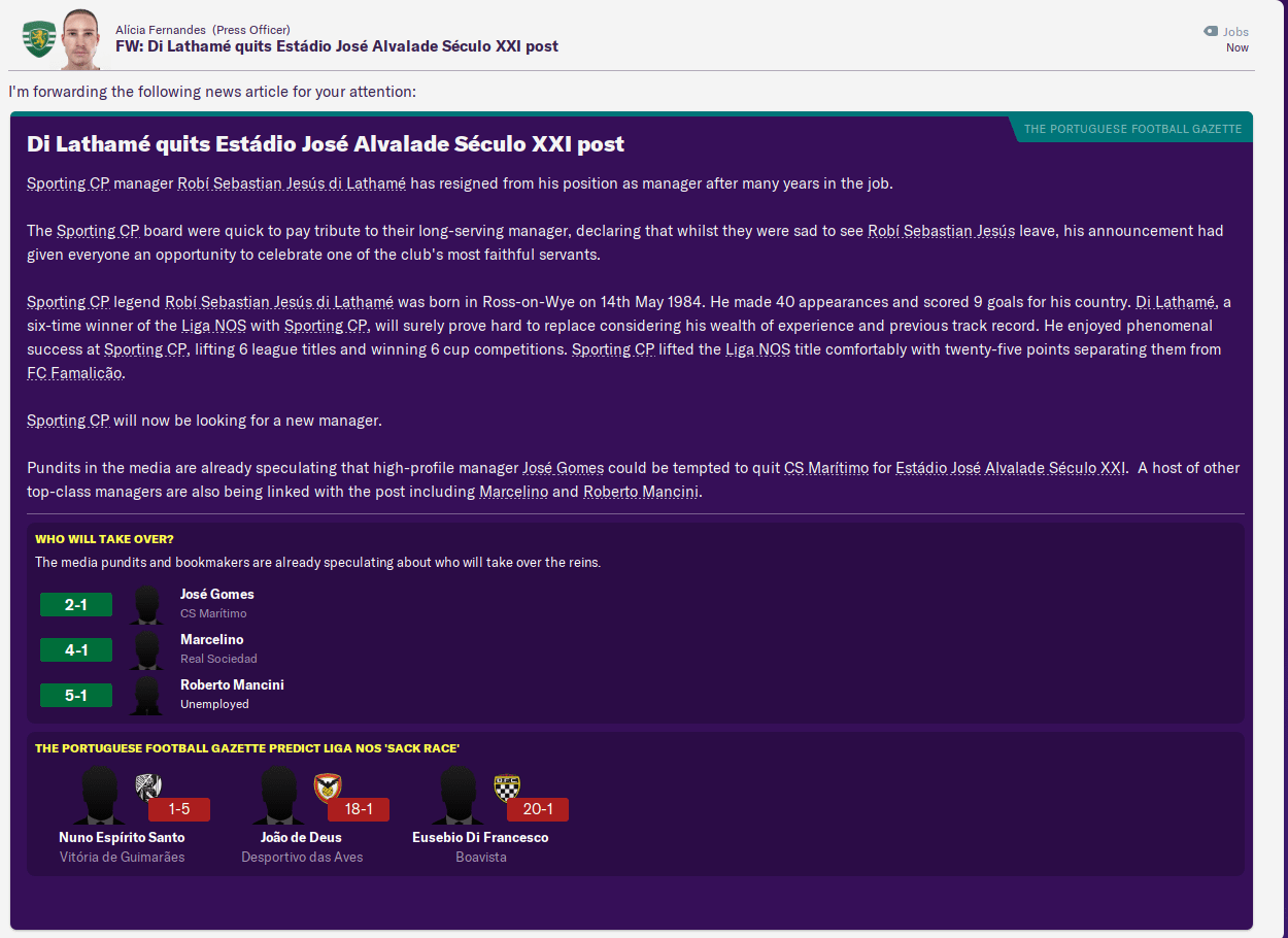 Unfortunately, I then realised I only had the Spanish league turned on in addition to Portugal, so my options were limited when I started looking around the job market. But I turned on the English, French, German and Italian leagues for the next summer and waited for an opportunity to come up.