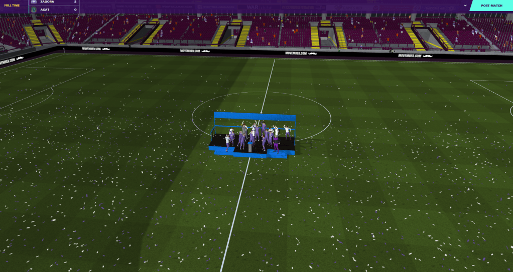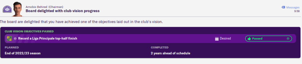 But we then went to the team below us in the league and lost 3-0, although their first two goals were from their first two shots. Pretty annoying… but, results elsewhere secured our place in the Liga Principale playoffs THREE years ahead of our club vision! I hadn’t realised, as I was still working on the assumption that it was a 46 game season… it’s not, it’s 42. Oops.