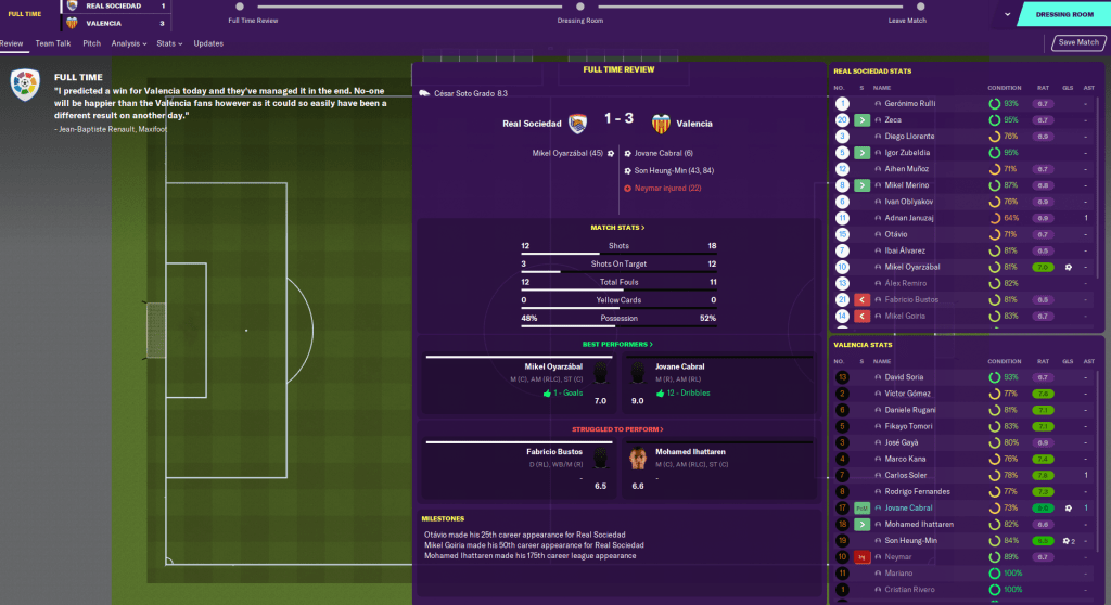 As luck would have it, Sociedad went down the other end to pull one back through Mikel Oyarzabal, and I presumed FM was about to screw us over. However, I told the lads not to get complacent and Sociedad offered nothing, then Son went and finished things off with 6 minutes remaining.