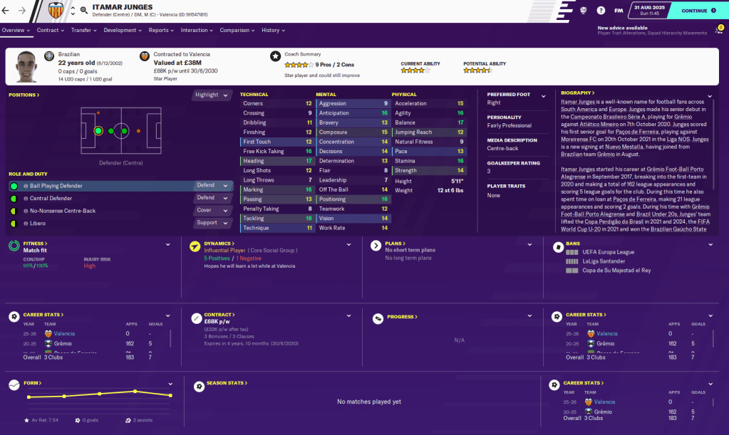 I think Itamar Junges could be an absolute world beater and we snapped him up for just £9.75 million from Gremio. And, immediately after his debut for us, he went and made his debut for Brazil and scored on his second cap! Strangely, which I realised going into his debut, he is the only regen in our starting eleven… in 2025. That’s pretty unacceptable.
