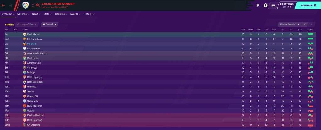 The day before, Real put 9 past Osasuna with Mbappe bagging 4 in a game for the second time this season! They’ve scored 41 times already this season and are looking pretty unstoppable. But after 10 matches in Spain we sit in third behind Real and Barca with 8 wins and 2 defeats, with a 7 point buffer back to Leganes in 4th.