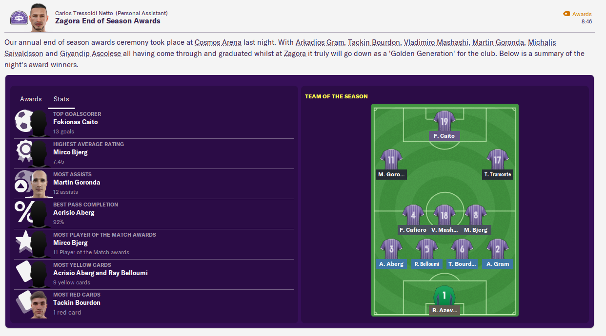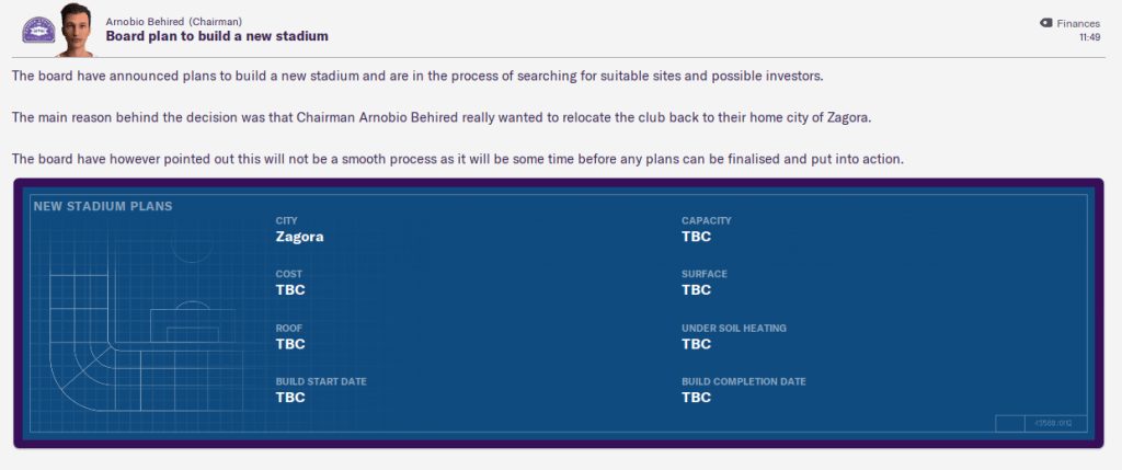Other exciting news is that our youth recruitment is being improved, while the board is also looking into building a new stadium in Zagora! Until then, we’ll be playing at our third stadium of the save at the 30,599 capacity Revelacio Arena that is home to Liga Principale side Qashid.