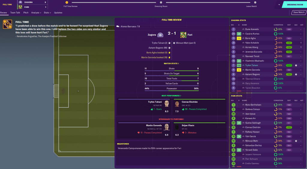 Things didn’t get much easier as we hosted perennial national champions Aswijan Malikiy in our second match, in which we were 13/2 to win at home! We played really well this time and were very unlucky to narrowly lose 1-0, holding Malikiy until the 60th minute and having a penalty awarded to us then taken away by VAR – which I’m not sure ever previously seen on FM! So that was a bit dubious… but, the performance did give me a little ray of optimism.